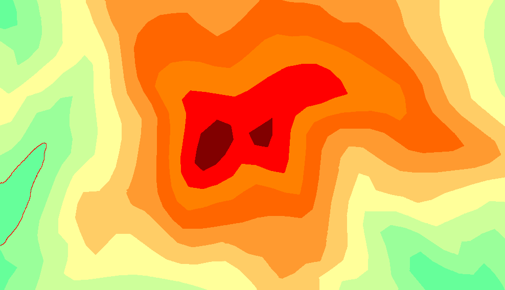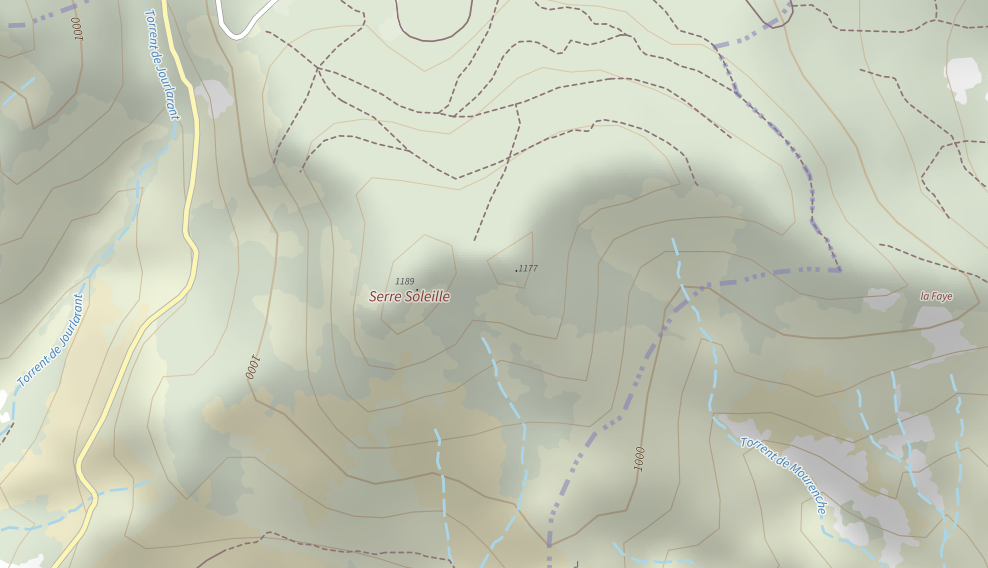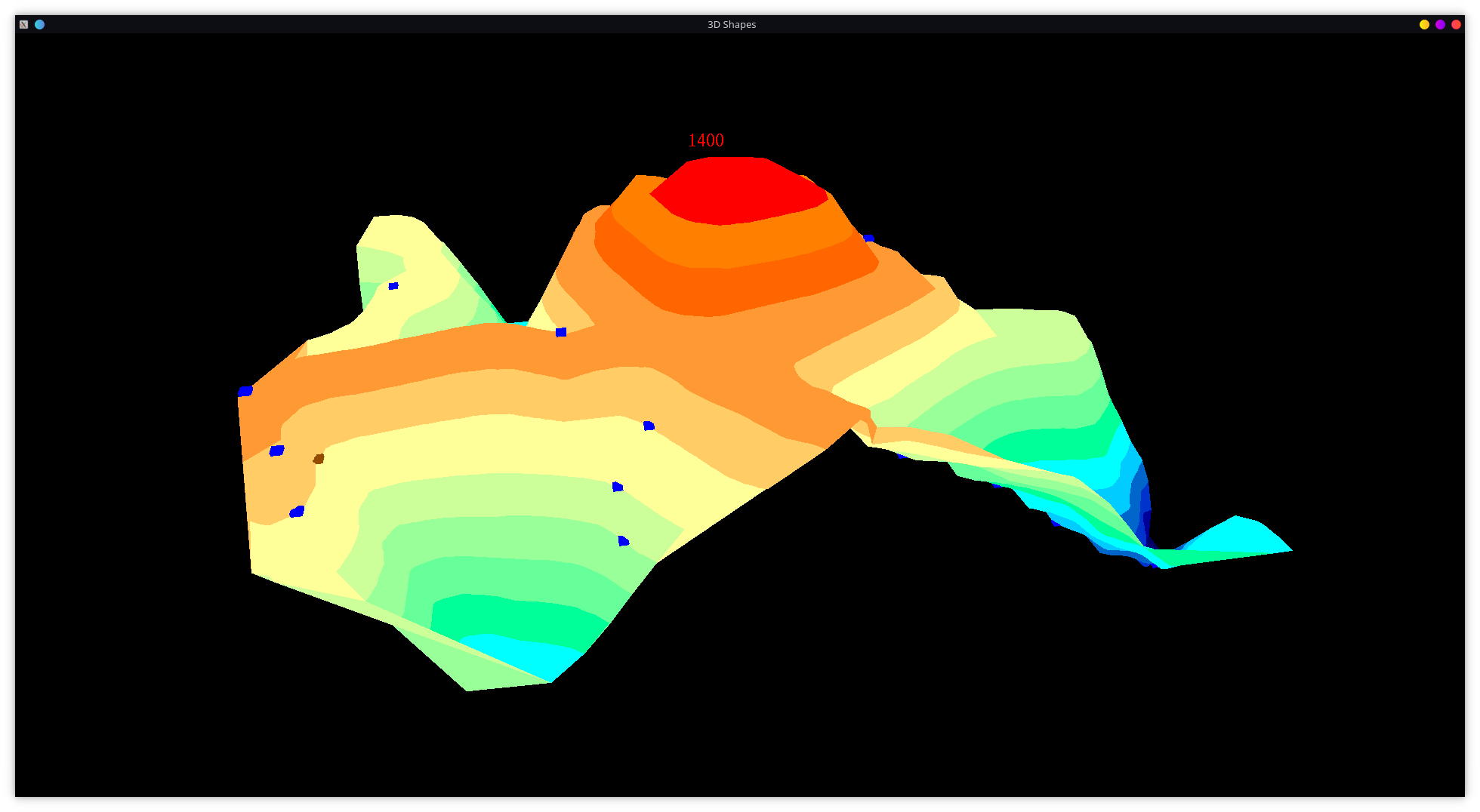 La modélisation à été améliorée avce l'ajout des surfaces entre les lignes topographiques. Chaque couleur correspond à une altitude entre deux lignes. Les couleurs froides modélisent les zones les plus basse de la carte tandis que les couleurs chaudes correspondent aux altitudes les plus élevées. Nous avons également rajouté les cours d'eau, les sentier ainsi que les routes. Les altitudes max et min de la carte sont affichée au dessus de leur coordonnées.