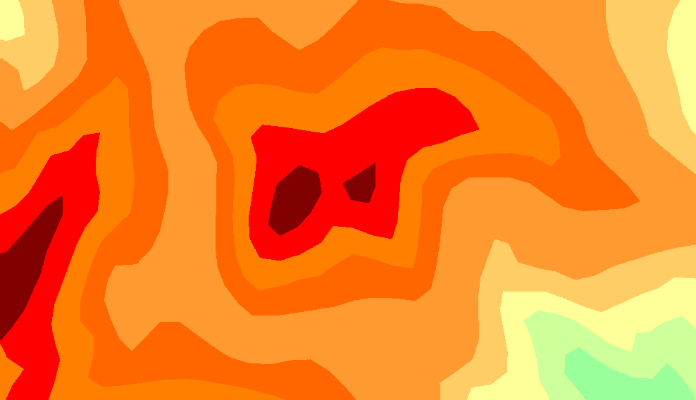 Il faut maintenant passer à l'attribution de l'altitude avec l'image traitée et réparée. La ou les zones les plus hautes vont être récupérées simplement car elle n'ont qu'une zone voisine. A partir de celles-là, on passe au zones suivant en réduisant l'altitude à chaque fois. Le résultats est ci-dessus à droite, l'altitude la plus haute correspond à la couleur la plus chaude et l'altitude la plus basse à la couleur la plus froide.