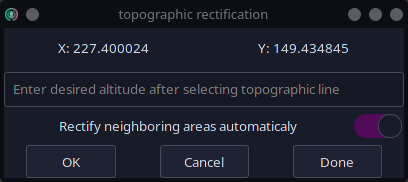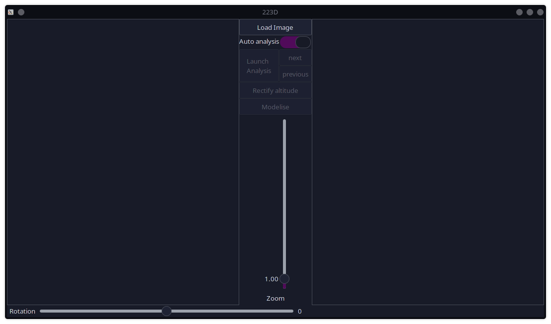 L'interface permet d'accéder à de nouvelles fonctionalité de l'application telles que le choix de l'analyse automatique qui détecte les couleurs à extraire, ou manuel qui demande de choisir les couleurs. Une exécution en pas à pas permet d'afficher les images intermédiaire qui ont été générées et de revenir aux précédentes. La rectification de l'altitude prends aussi place ici et finalement la modélisation ouvre la fenêtre de rendu 3D.